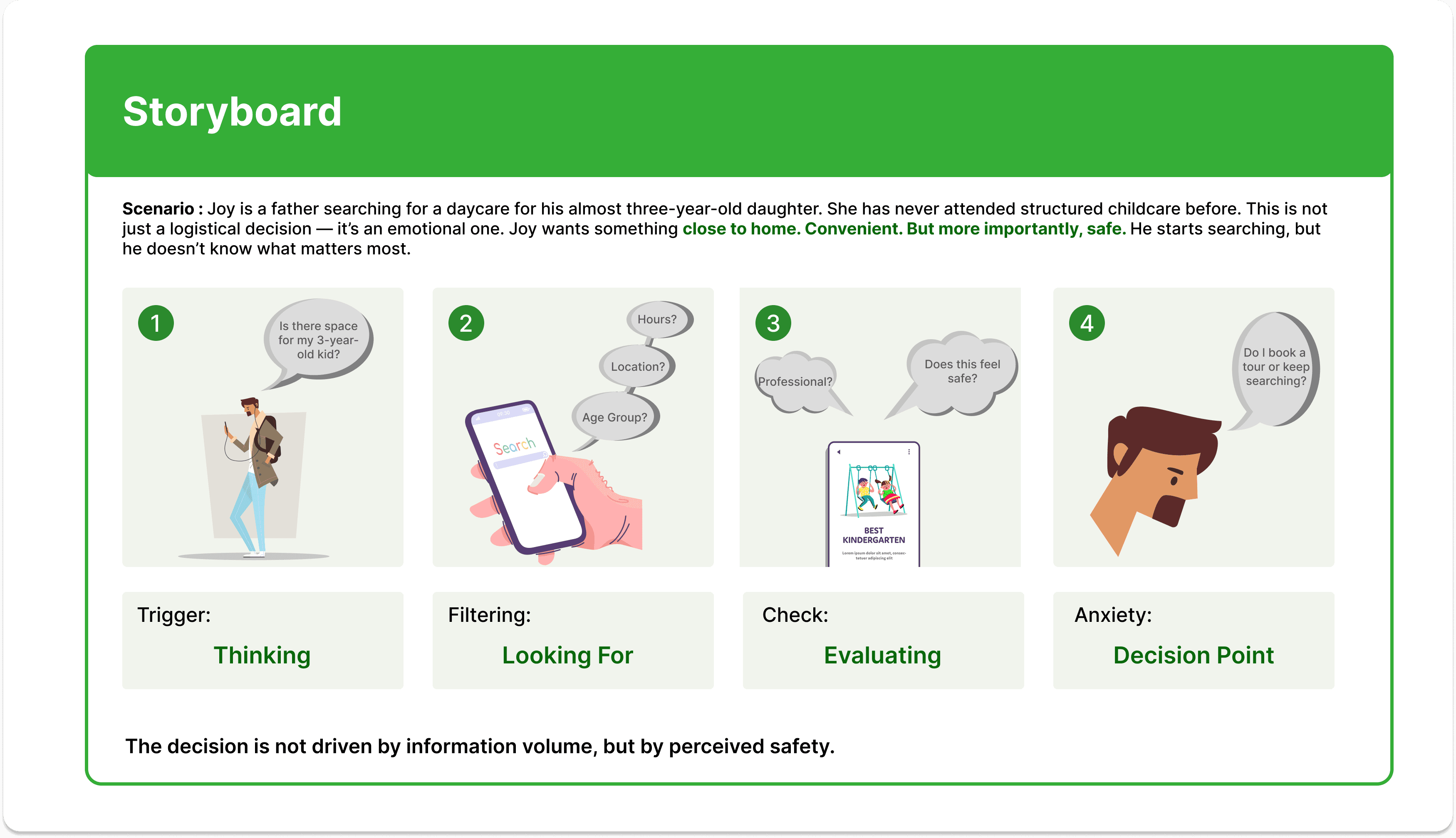 I reframed the project as designing a structured evaluation pathway for parents navigating childcare decisions.
