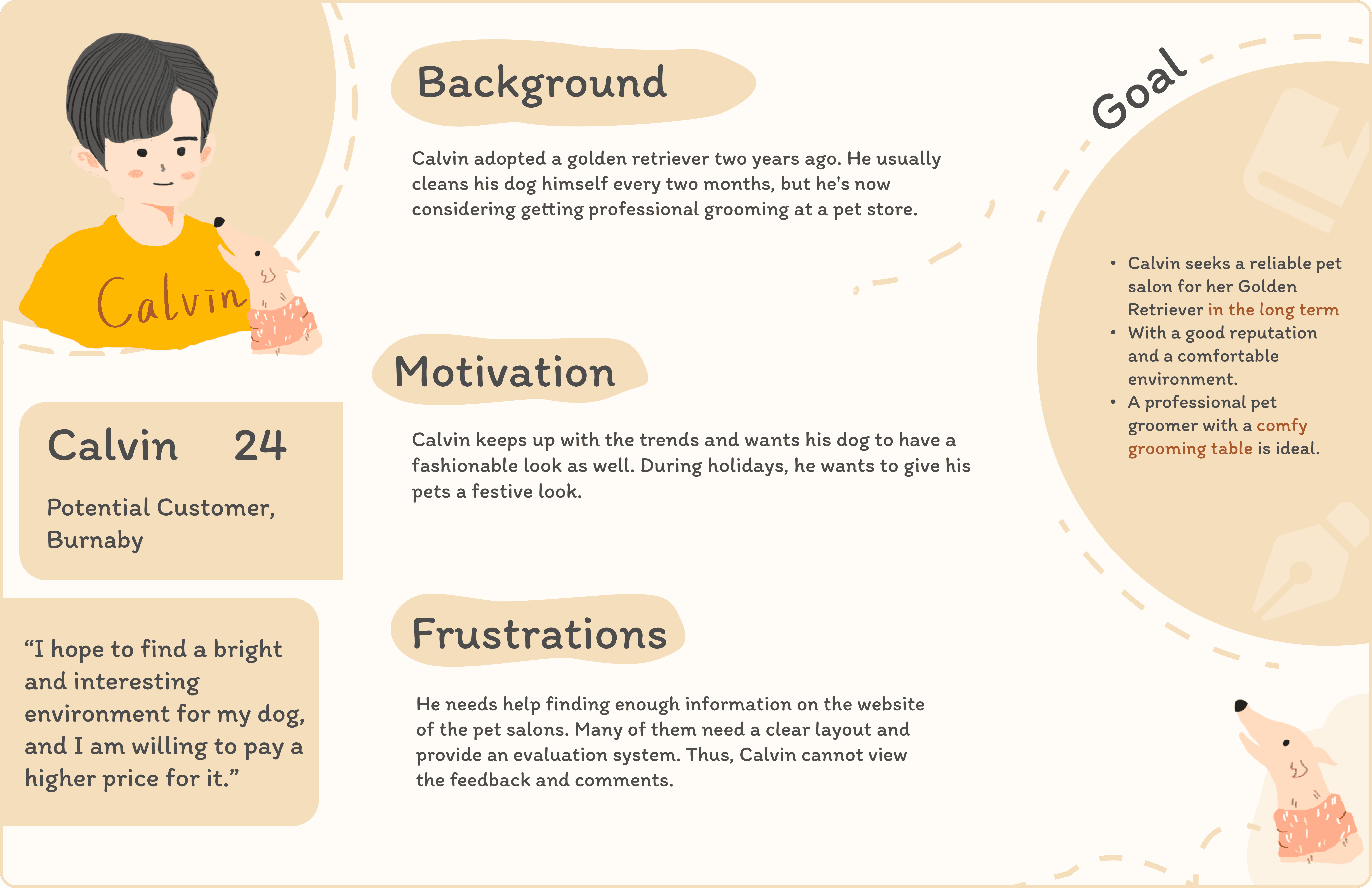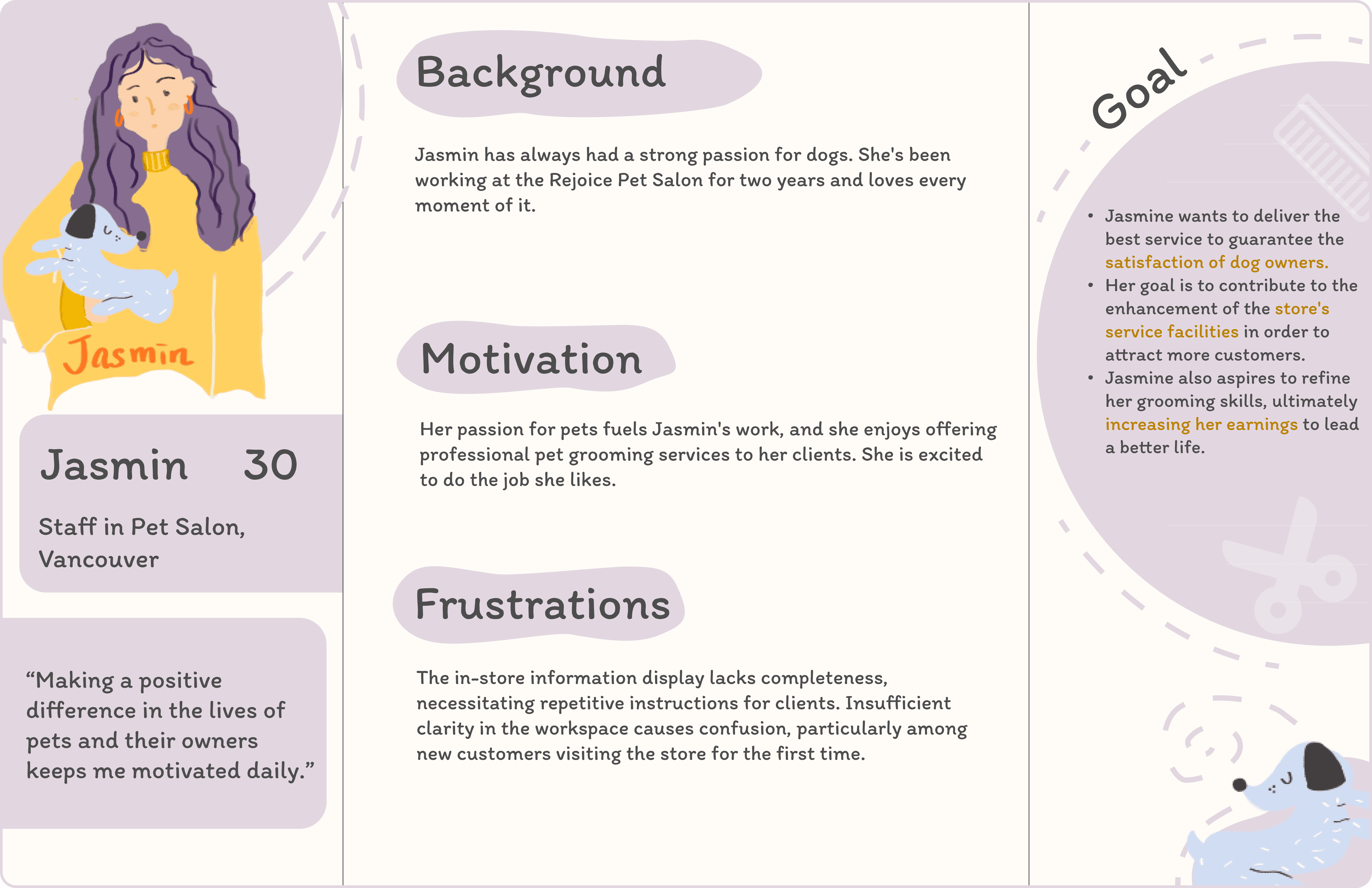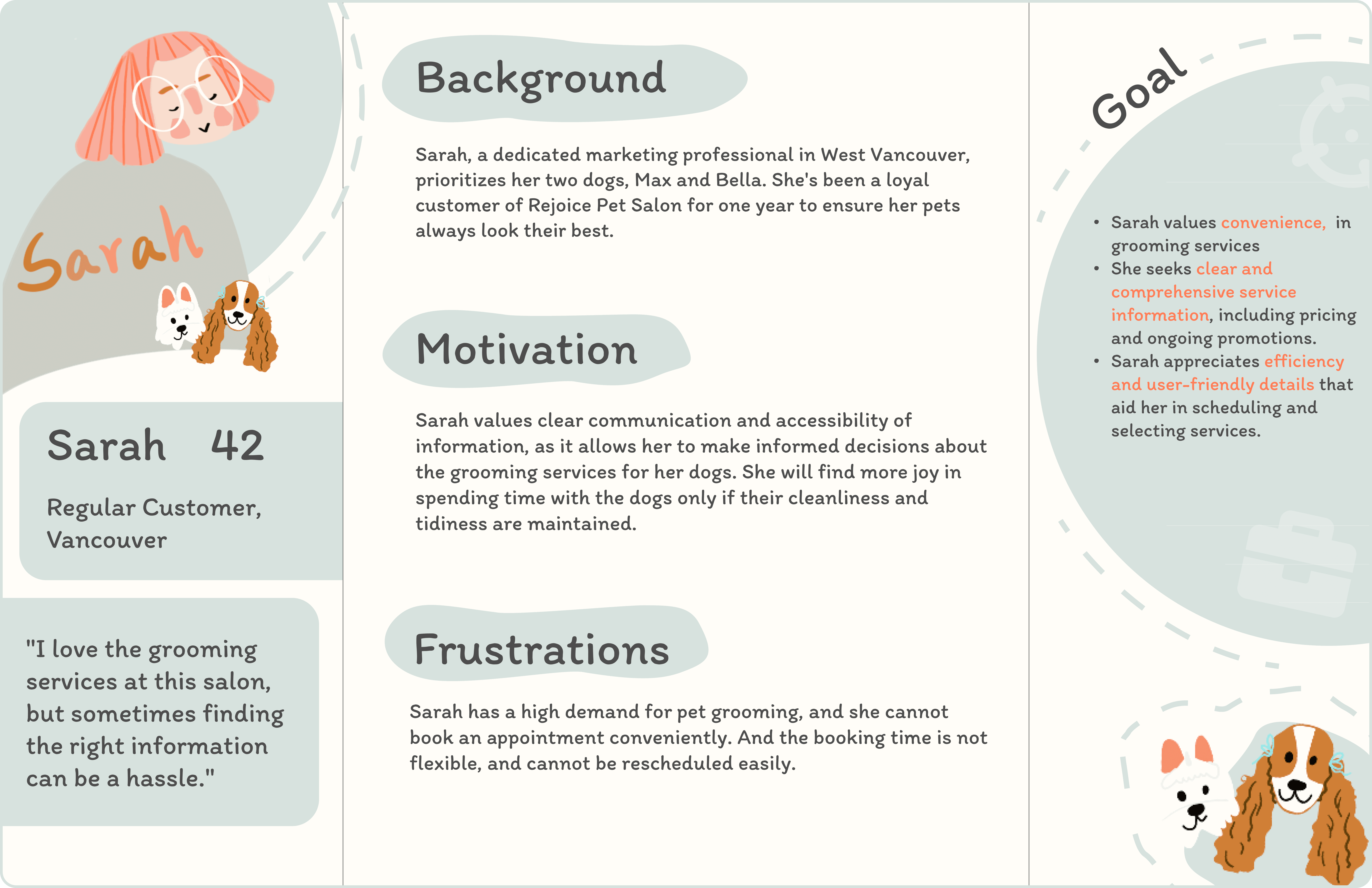 Their insights helped shape our understanding of their needs and thoughts about pet salons. This effort led us to create three distinct personas, reflecting the diverse perspectives we encountered.