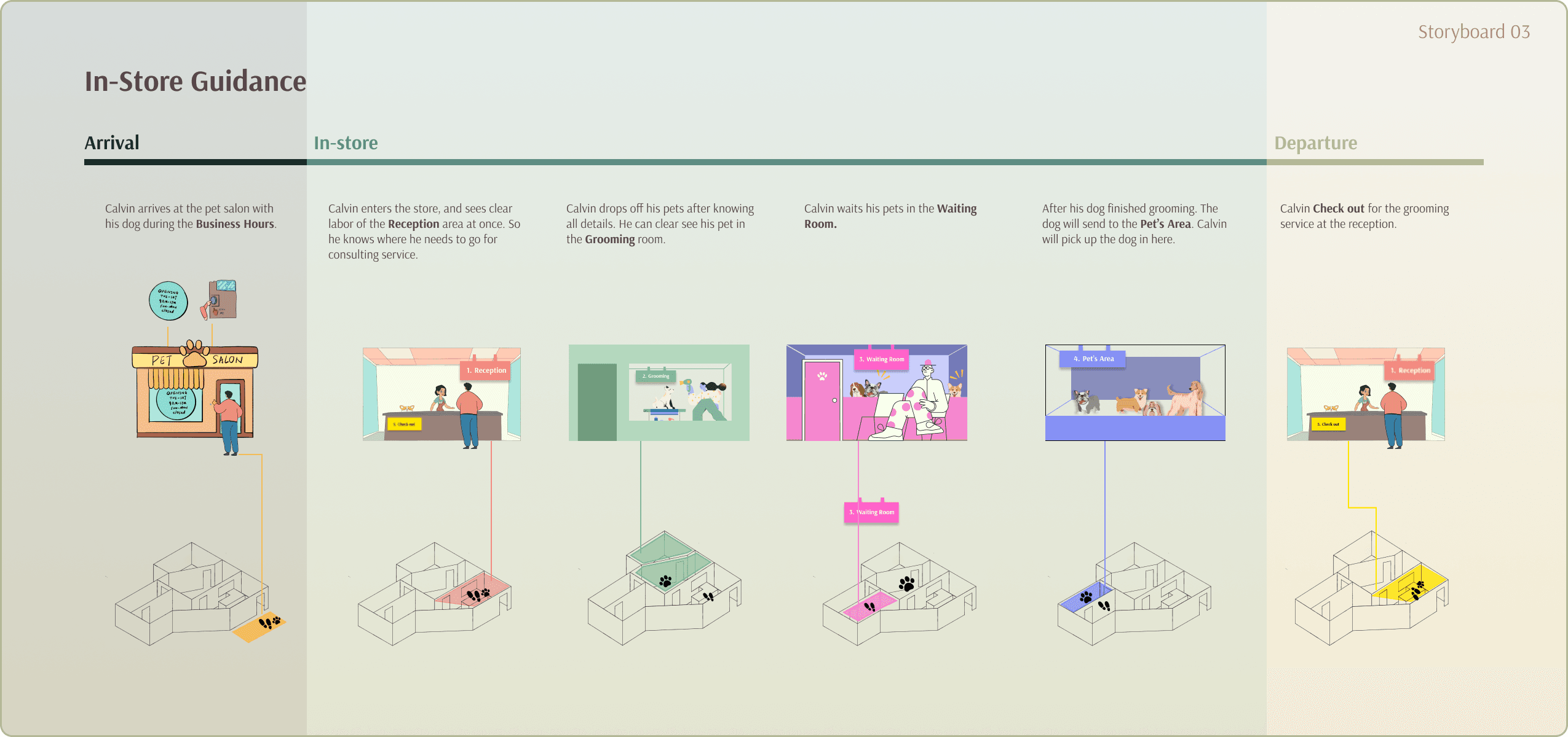 These journey maps show the entire pet salon store's service process and the psychological changes in employees and clients. By organizing them, we can better find our customers' pain points.