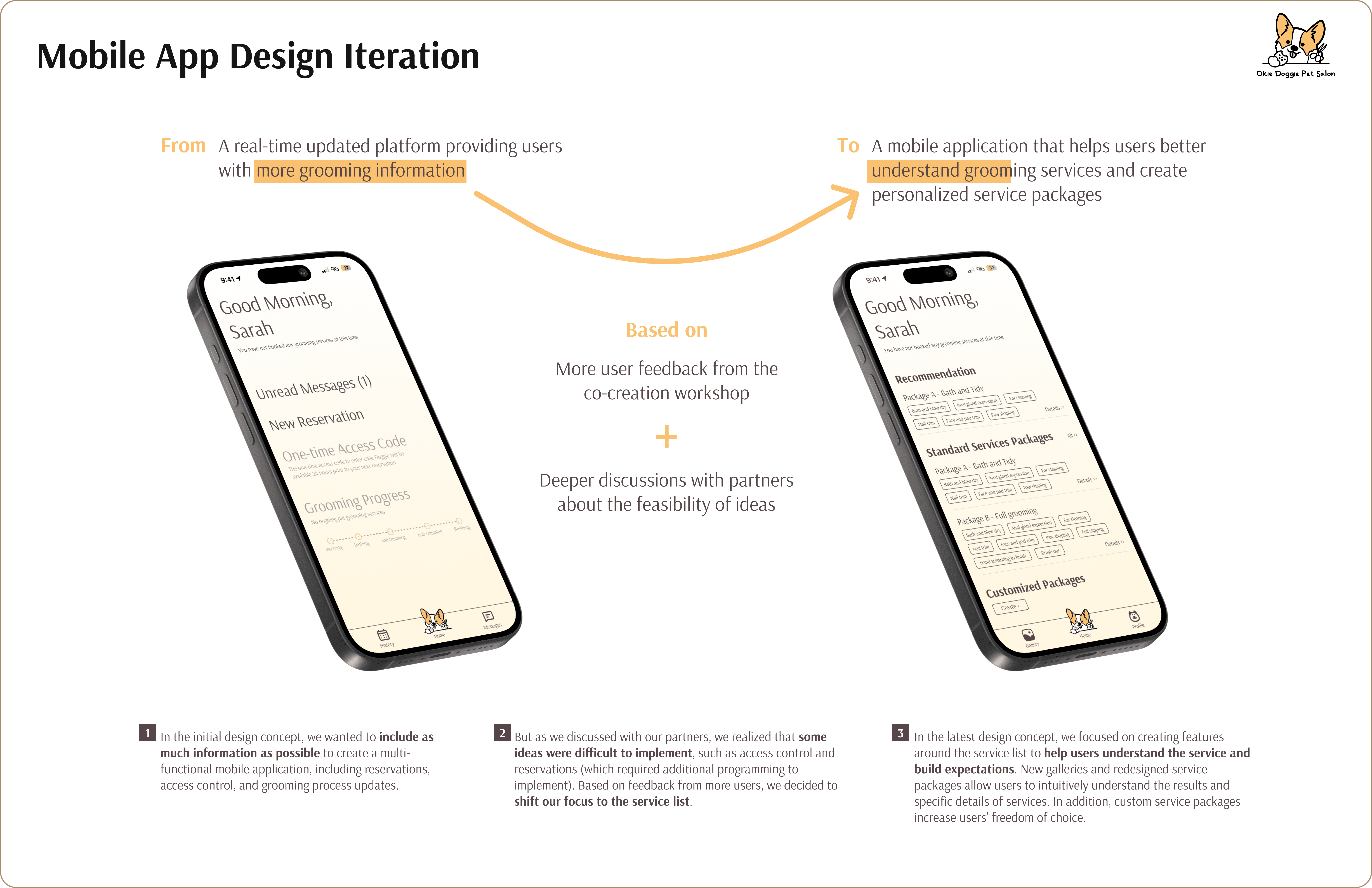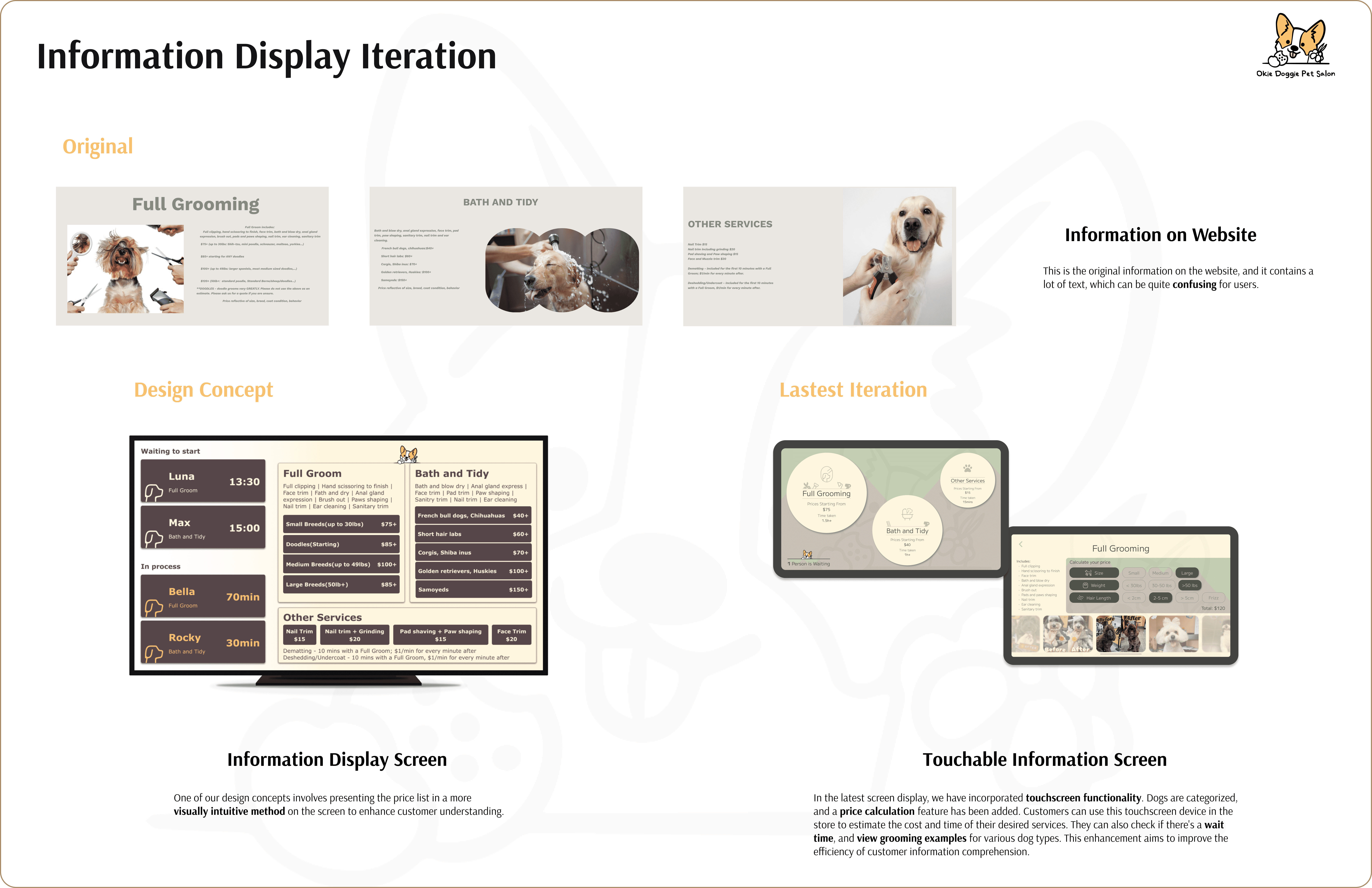 The Okie Doggie project was an academic course on interaction and user experience design. It allowed our team to create designs with input from various stakeholders. We had theoretical knowledge and practical experience by the end, leading to a final interaction design project. Lucas, the owner of Okie Doggie Pet Salon, was a key collaborator. I reached out to him, established trust, and updated him weekly. His cooperation and trust were essential to the project's success.