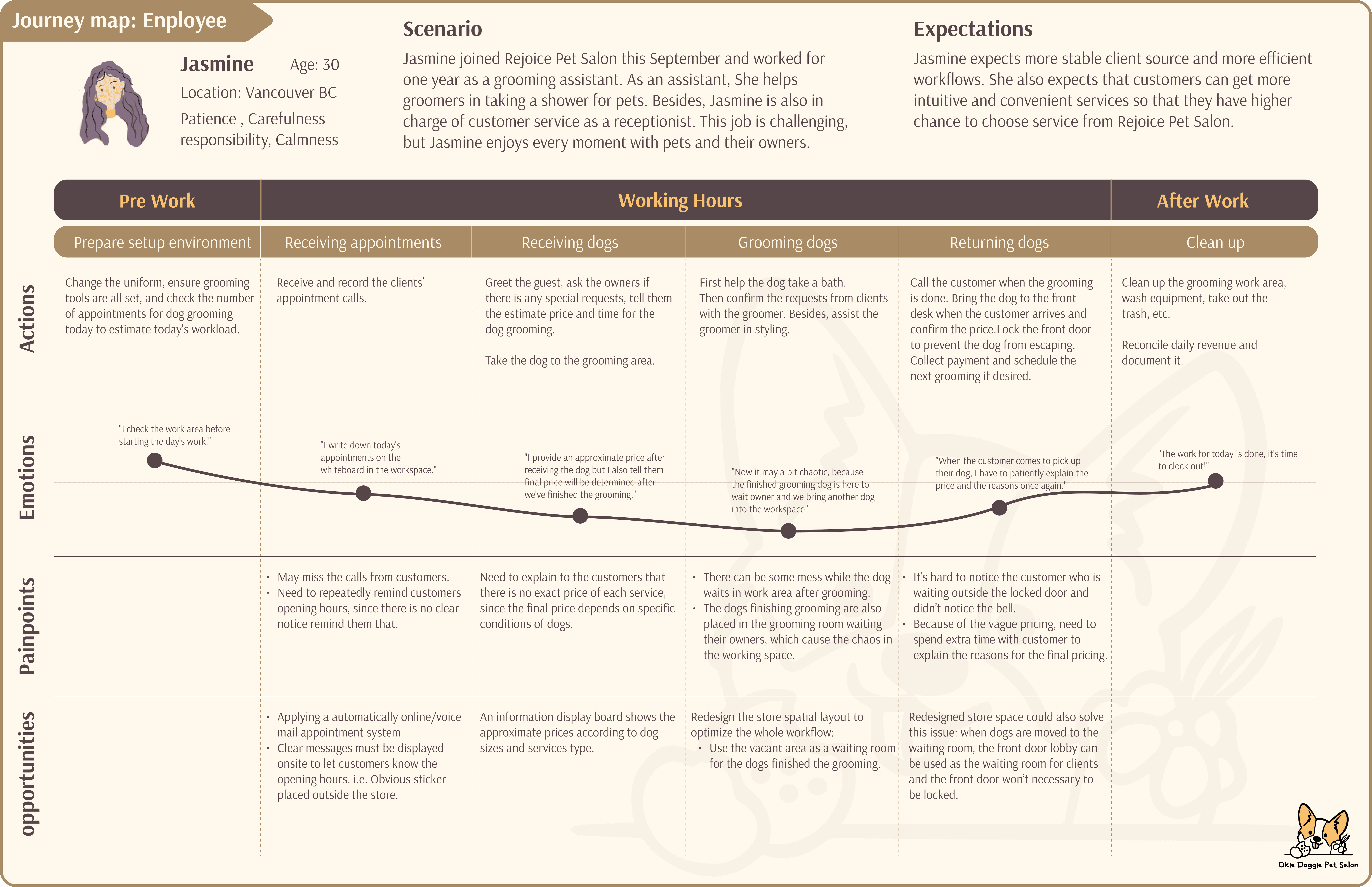 Through the interviews and observations, we conducted an hour-long interview with another staff member of Okie Doggie during the persona. We simulated two journey maps, which represent the psychological changes in the service process from the perspectives of employees and guests.