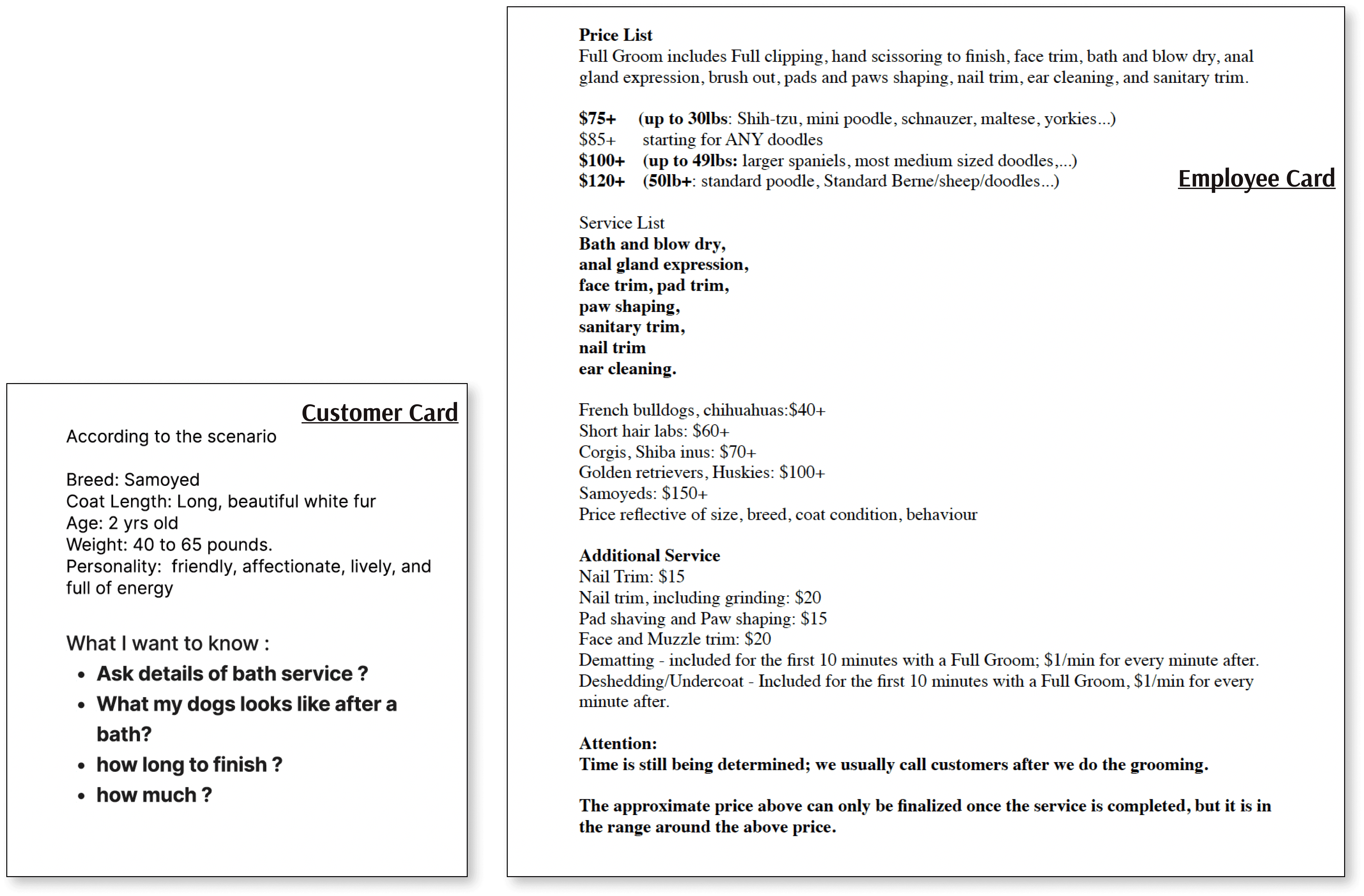 We asked our workshop participants to place themselves in a conversation between a customer looking for information about bathing service and a store employee having information about grooming services.