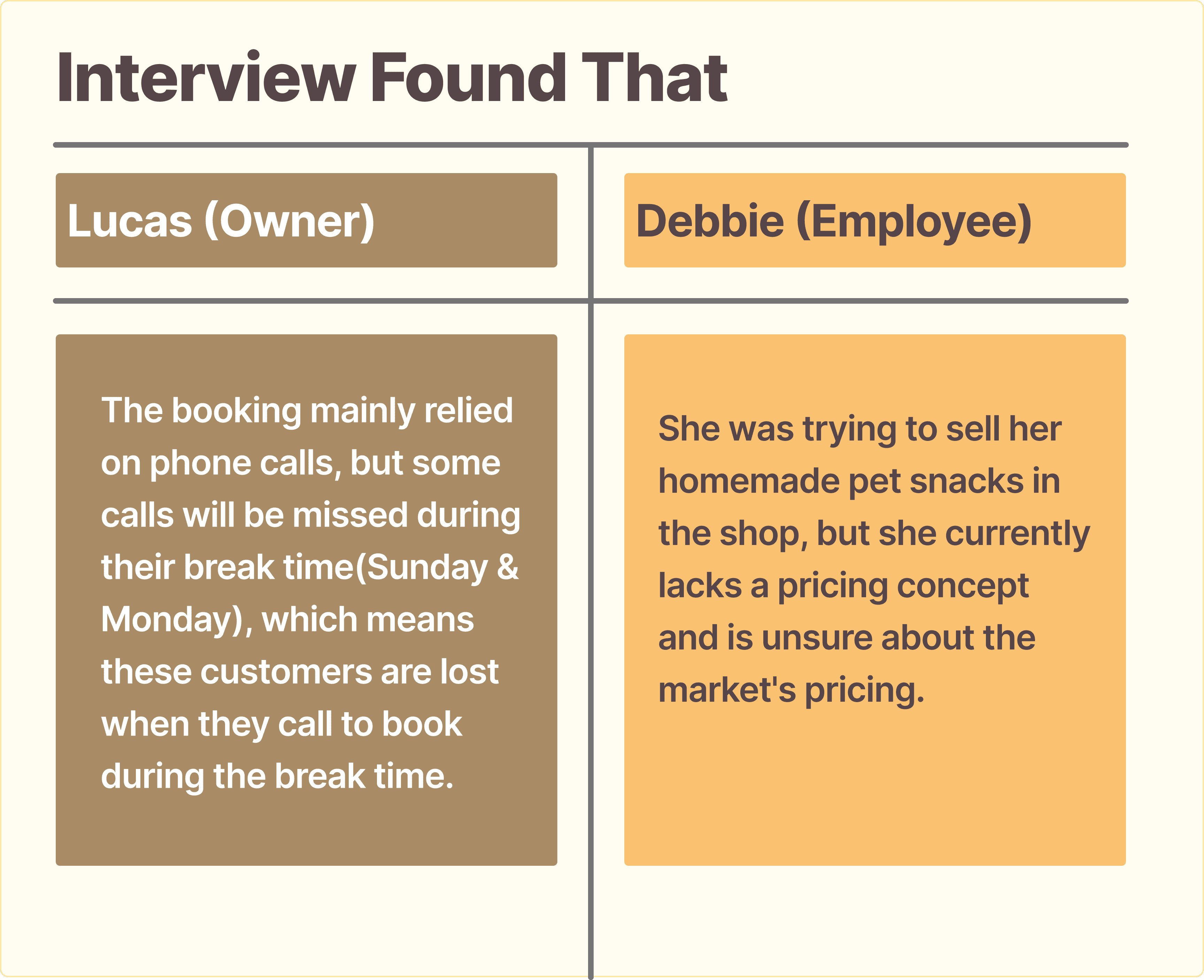 To understand the direction of our interaction design solution, we first conducted a one-hour interview and two-hour workflow observations with owner Lucas and employee Debbie. This interview allowed us to gain insights into their customer pain points.