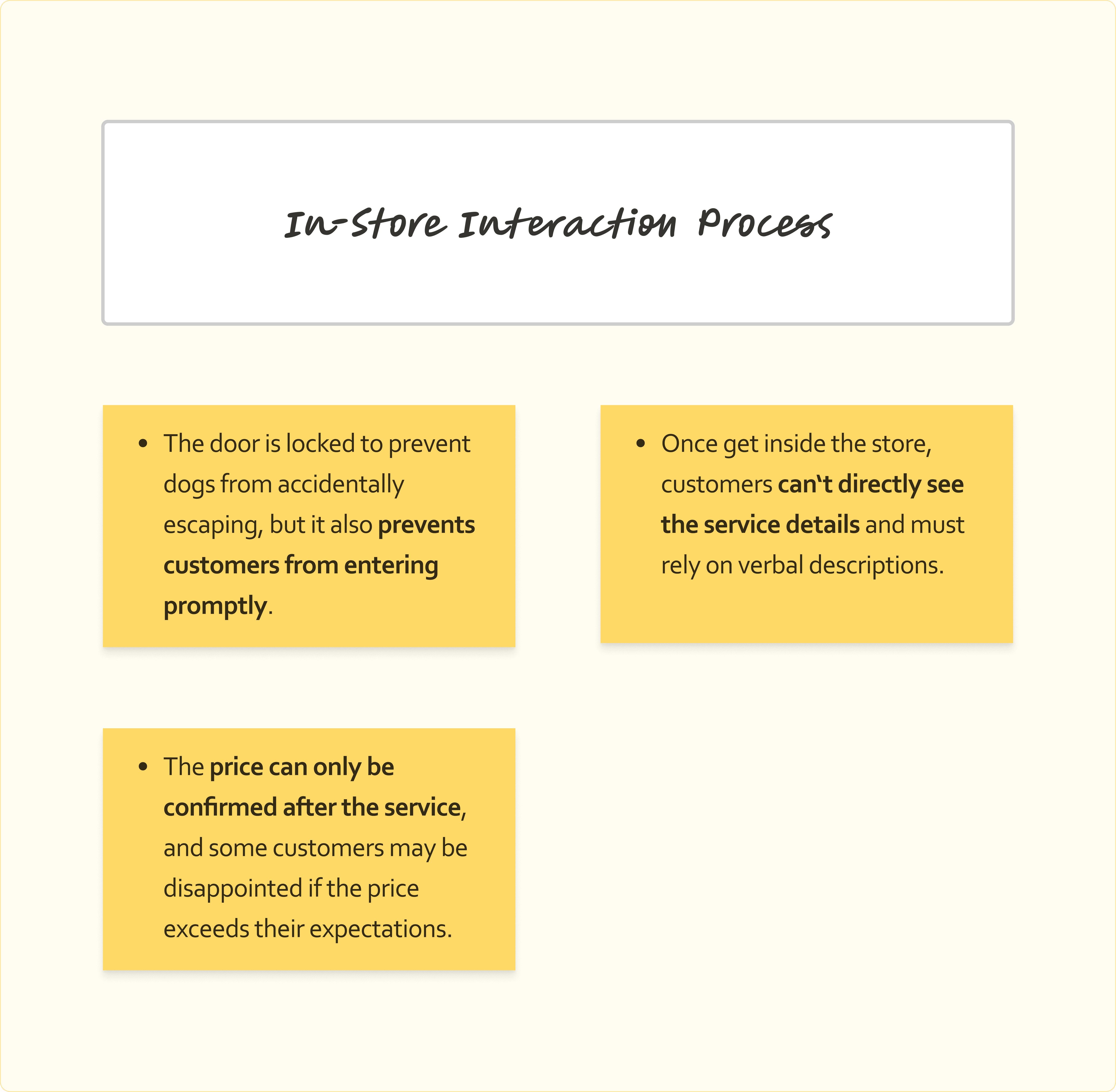 We conducted a two-hour in-store observation session with two team members, focusing on interactions involving customers and store employees during dog drop-offs and pick-ups. Through this field observation, we gained valuable insights into the customer flow dynamics within the store environment.